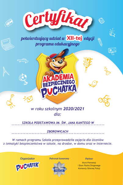 We wrześniu 2014 r. Zespół Szkół Publicznych im Św. Jana Kantego w Zborowicach przystąpił po raz drugi do akcji „ODBLASKOWA SZKOŁA". W zeszłym roku uczniowie naszej szkoły w ramach tej akcji zostali wyposażeni w opaski, breloczki oraz inne gadżety odblaskowe. W związku z wejściemnowej ustawy z dnia 31 sierpnia 2014 rokunakładającej obowiązek noszenia odblasków po zmierzchu na drodze poza obszarem zabudowanym, rada pedagogiczna podjęładecyzję, aby wyposażyć wszystkich uczniów szkoły podstawowej w kamizelki odblaskowe.Naszą akcję zakupu kamizelekodblaskowych wsparli finansowo miejscowi przedsiębiorcy m.in. ( Biuro Rachunkowe Wróbel, FHU HITPOL, Dziuban J. - Warsztat samochodowy).