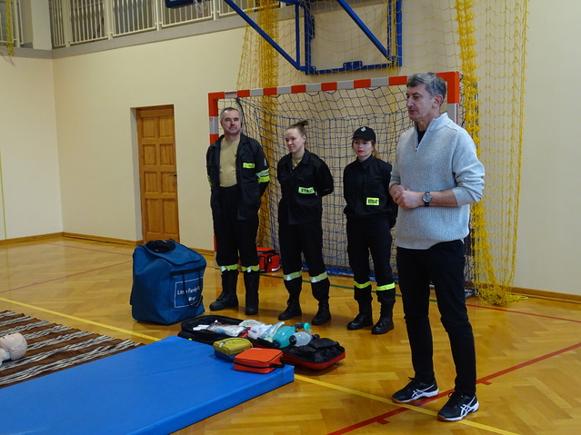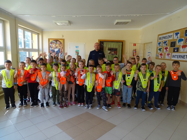 Policjant przekazał kamizelki odblaskowe dla klasy 1 oraz opaski odblaskowe dla klas 2–3.